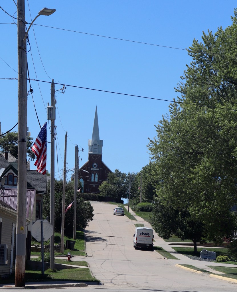 There are two churches in the town. The one straight ahead, sitting majestically atop the hill, and the smaller one in my rearview mirror, on the other side of the park. It was a town of The Catholics and The Non-Catholics. It was The Catholics who built upon the hill.  No modest, unassuming structure for them, thank you kindly. The imposing brick structure had been one of five:  the church, the rectory, the convent, the grade school, and the high school. The brick convent, grade school and high school were torn down years after I moved away.