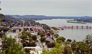 As you cruise down the street into town, you’ll notice that the Mississippi is at one of its wider parts here, and that the banks along the river are well cared for by the town.  Benches aresecured here and there, next to a continuous and gently curving brick walkway.  The drive offers you a direct view of the river’s lock and dam.  If you’re lucky, you can catch a barge taking its turn going through the lock.  The town’s banners, which hang from the street poles, proudly carry the slogan, “Where eagles soar,” because they do soar here.  They swoop gracefully down to the surface of the water near the lock and dam, grabbing a fishy meal.  Often, they roost in a tree next to Riverview, the main street through town, sitting majestically on the upper branches.  The national bird is a favorite for sightseers, who come by bus to witness them in their natural environment.  Depending on the time of year, you can also spot white pelicans that stop and rest on the small island above the dam, during their migration south.